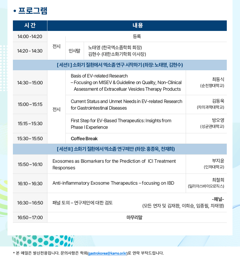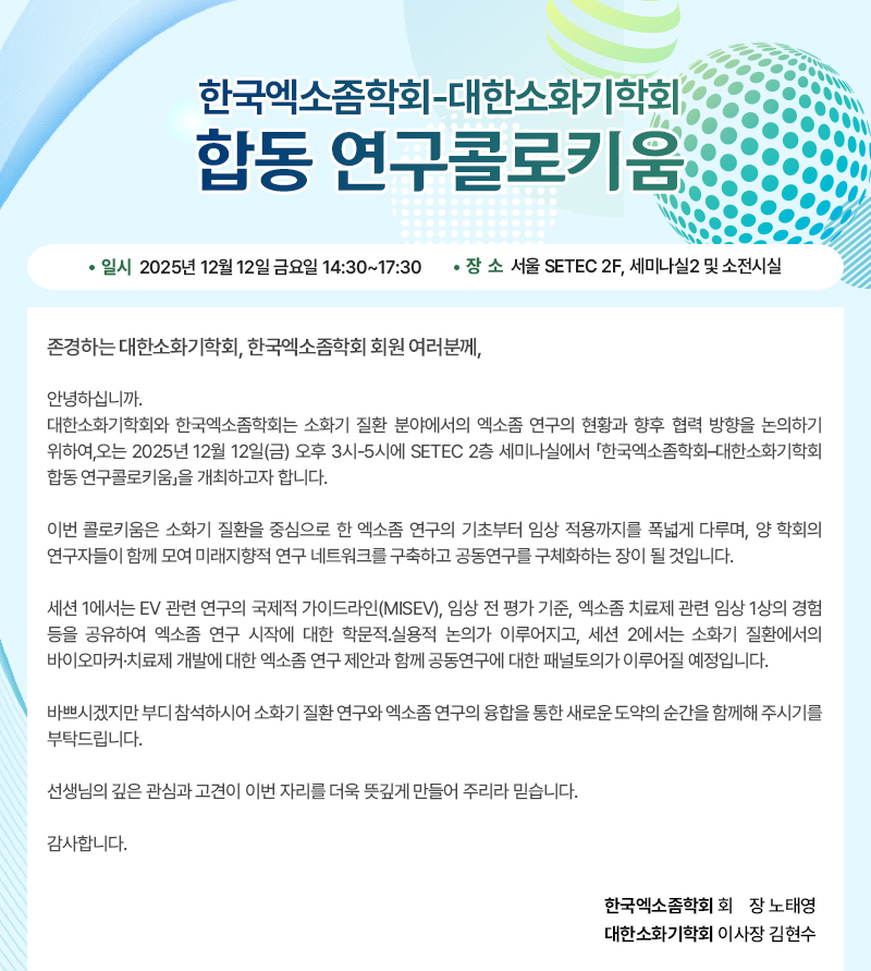 | 학회공지 | 한국엑소좀학회-대한소화기학회 합동 연구콜로키움 안내(12/12) | 2025.11.17 | ||